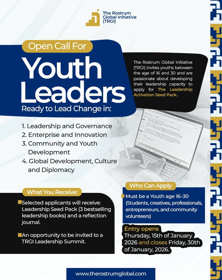 Transform your leadership journey in 2026: Selected youths will receive a Leadership Seed Pack with three bestselling leadership books, a reflection journal, and the chance to be invited to a TRGI Leadership Summit, creating a powerful springboard for disciplined and responsible leadership growth.